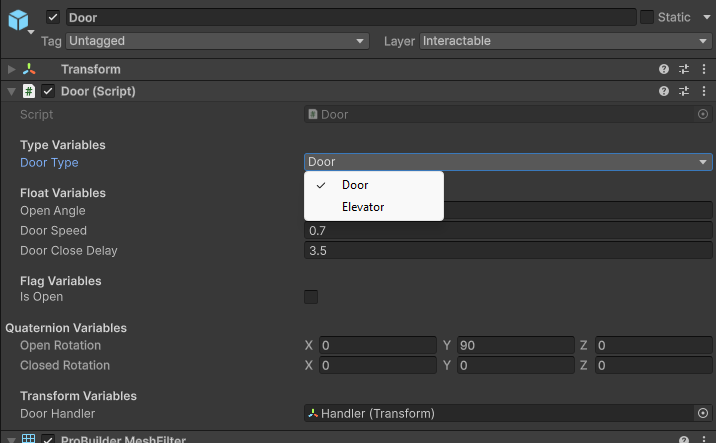 - Door → open/close with handler + coroutine-based auto-close.