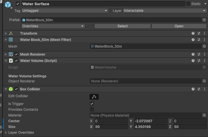 - Attach WaterVolume to a collider → swimming and diving transitions just work.