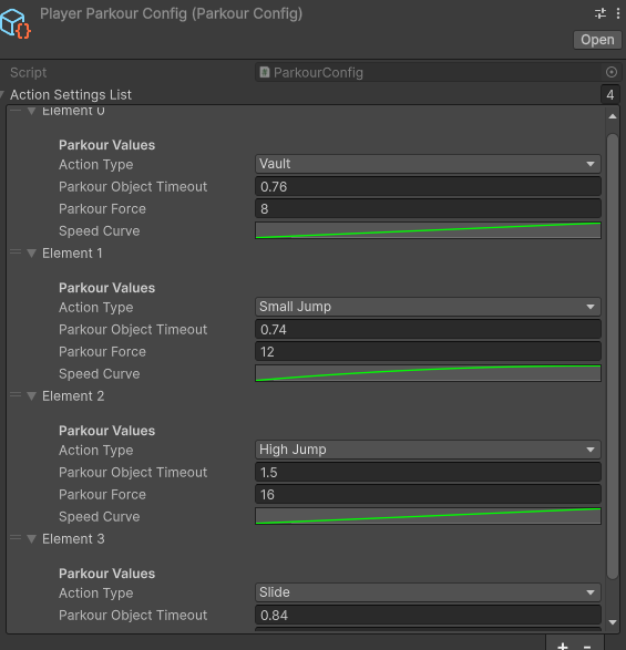 - Smooth motion curves → each action uses editable AnimationCurves to control force, timing, and acceleration for fluid motion.